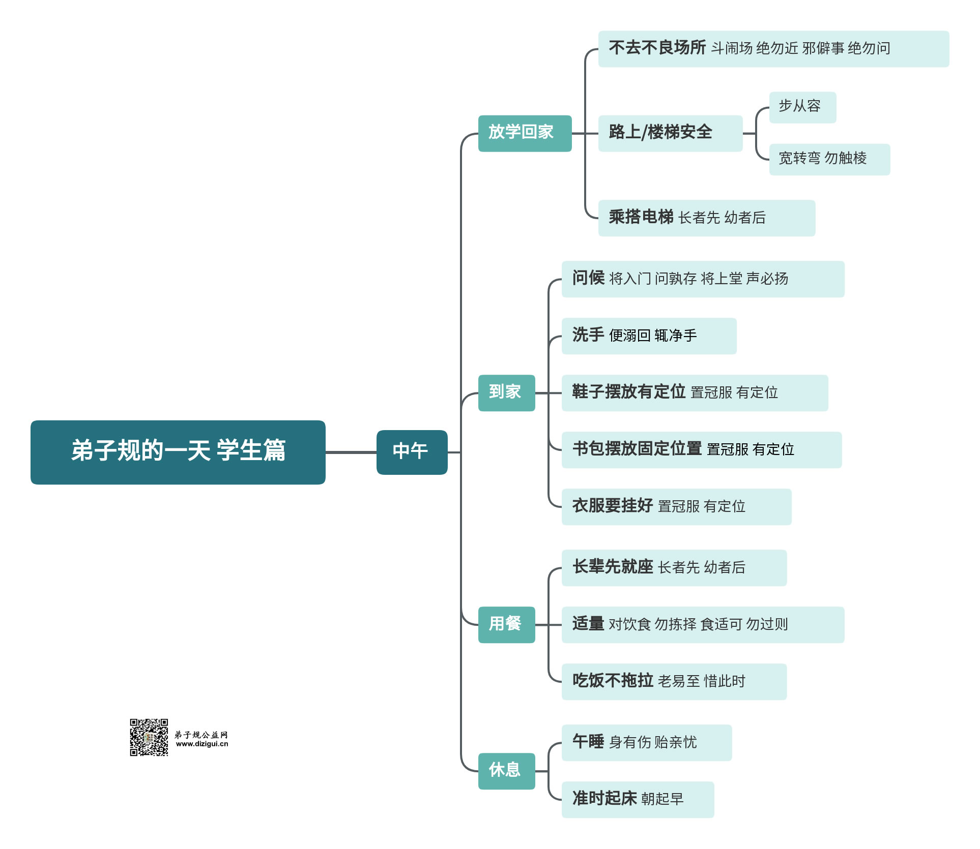 “弟子规的一天”按照时间顺序与场景,分别列出相应时间段可以执行的句子,讲明《弟子规》绝对能够在生活中做出来,弟子规就是一种生活方式,让我们更加幸福的生活方式 。