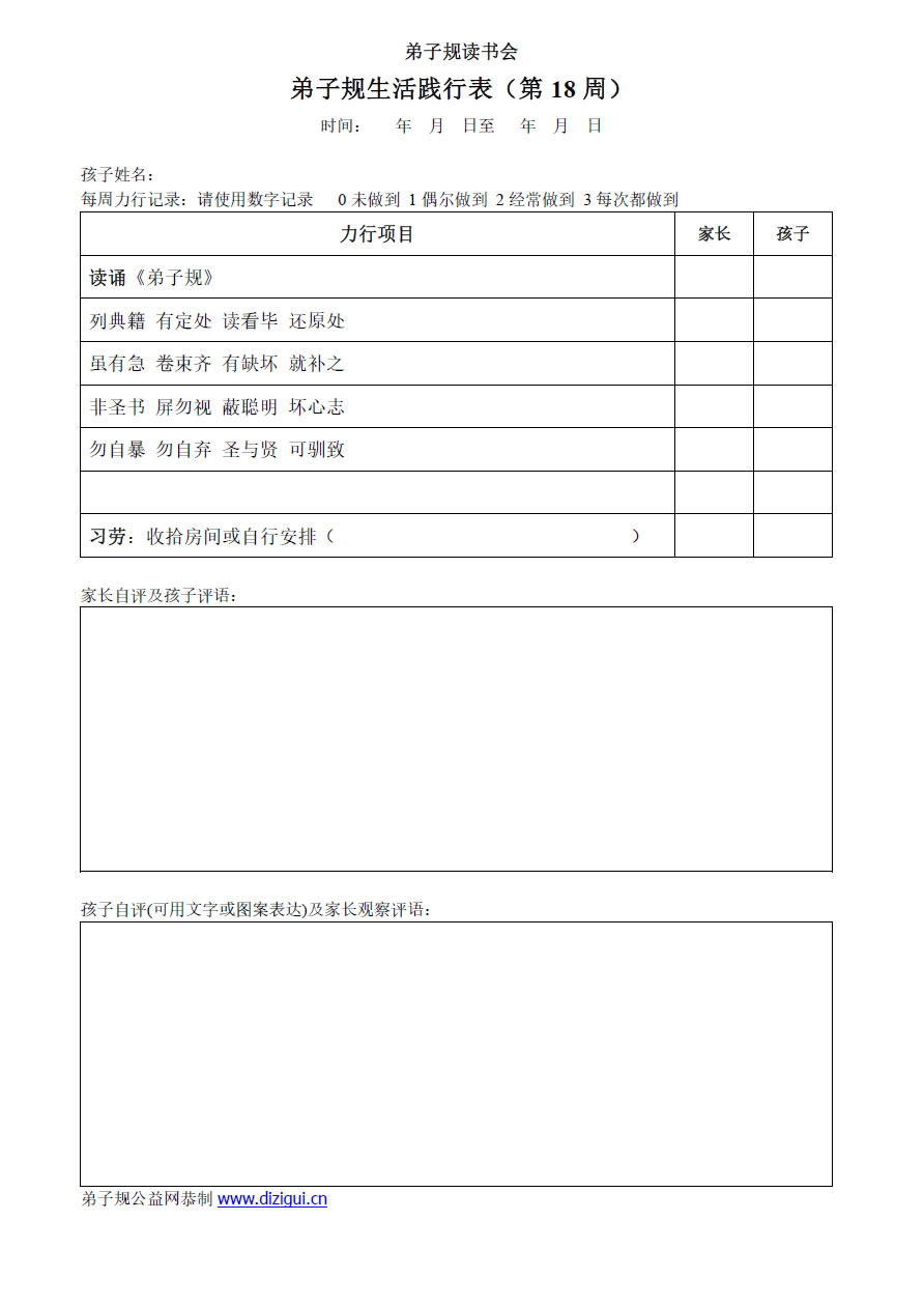 《弟子规》除了读诵之外,更应落实到生活、工作与学习之中,成为生活指南,故此编辑“弟子规生活践行表”(共18周),父母与孩子一起践行,成为共同的生活标准